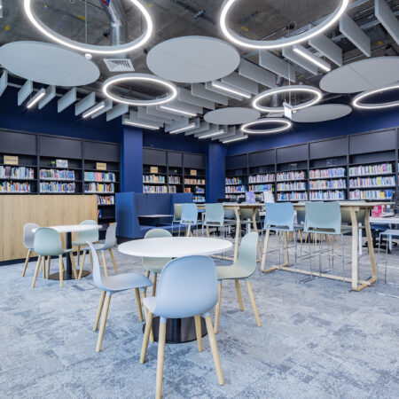 The main entrance addresses the primary pedestrian route, leading into an open ground floor with café, student support services and generous breakout areas for informal study and collaboration. A Learning Resource Centre and theatre occupy the first floor, with teaching accommodation located above.